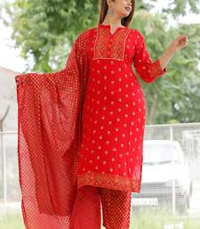 Girbana women red viscose rayon round neck kurta pant and dupatta set