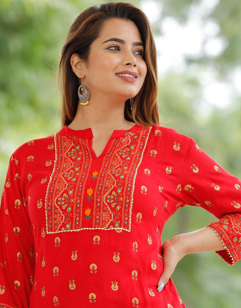 | Product Name | Girbana Women Red Viscose Rayon Round Neck Kurta Pant And Dupatta Set | |