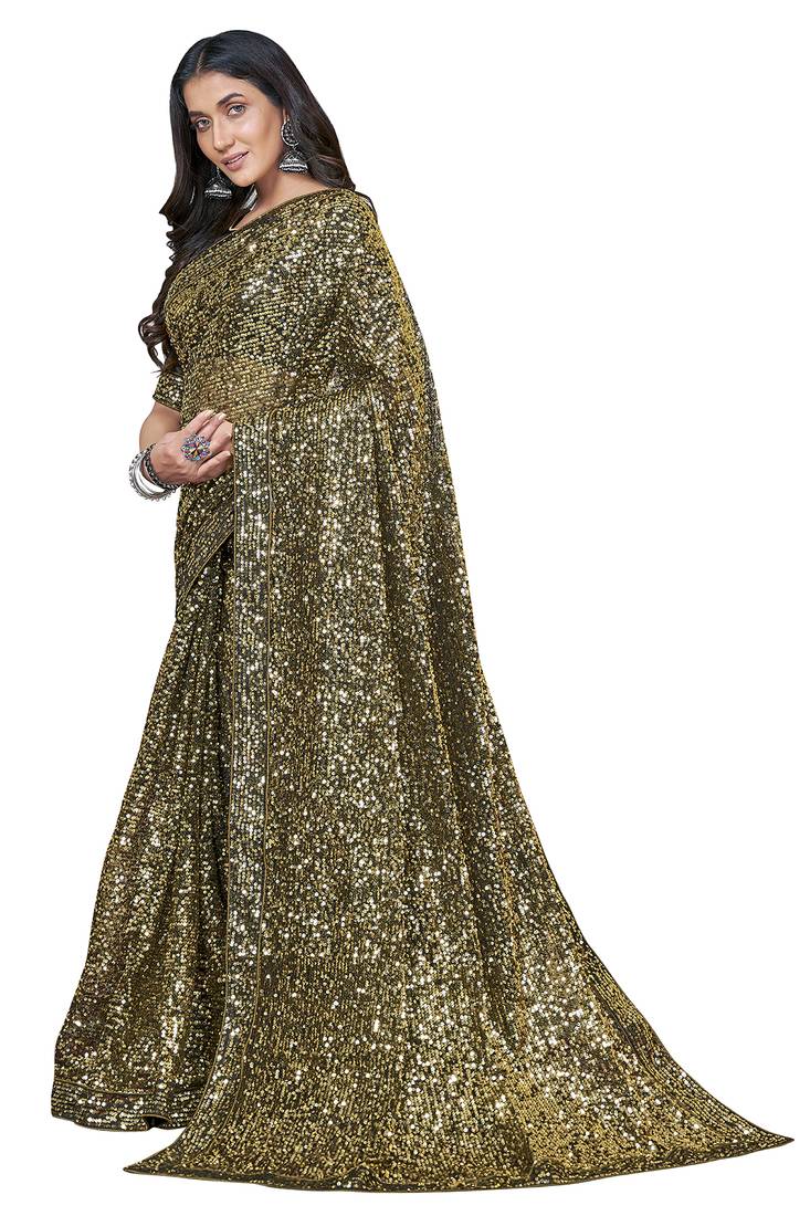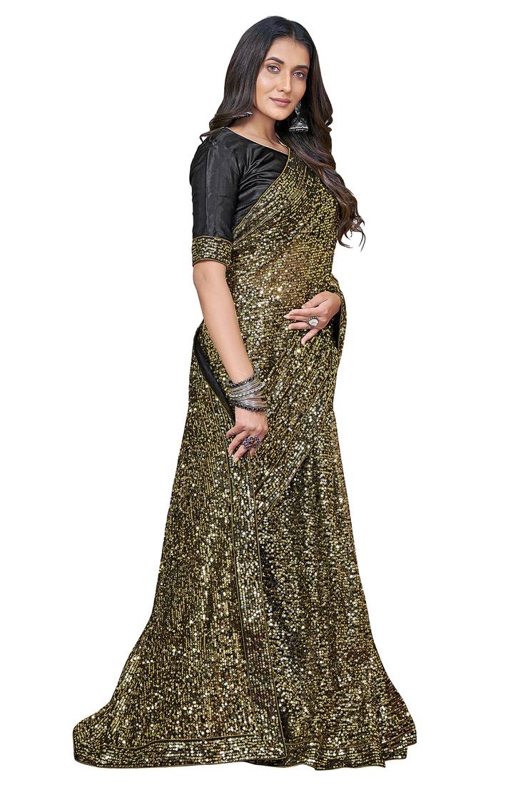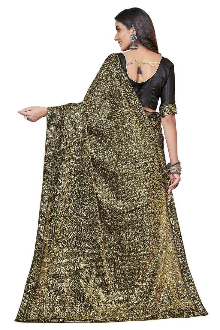| Product Description | Style: Designer Bollywood Saree, Saree Colour: Gold, Blouse Colour: Black, Saree Fabric: Net, Blouse Fabric: Satin Silk, Saree Length: 5.5 Mtr, Blouse Length: 0.8 Mtr, Saree Pattern: Sequined Embroidered Saree, Season: Any, Occasion: Wedding, Festival, Bridal, Party, Causal, Contains: Single Saree With Unstitched Blouse Piece |