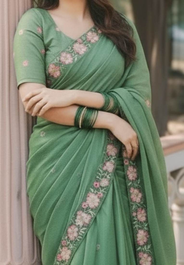 Green thread embroidery floral border work organza silk elegant festive style