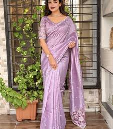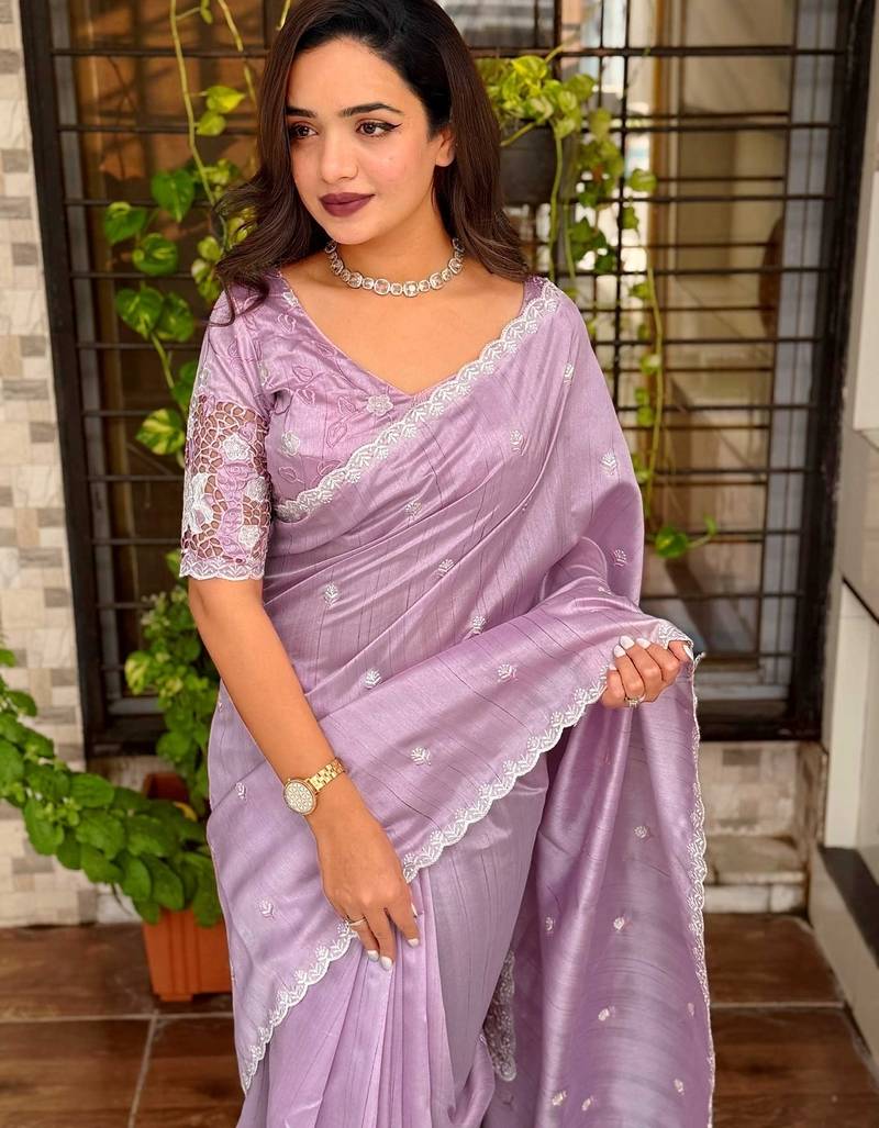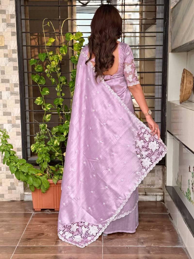 Lavender tussar cotton embroidery work saree with matching blouse piece