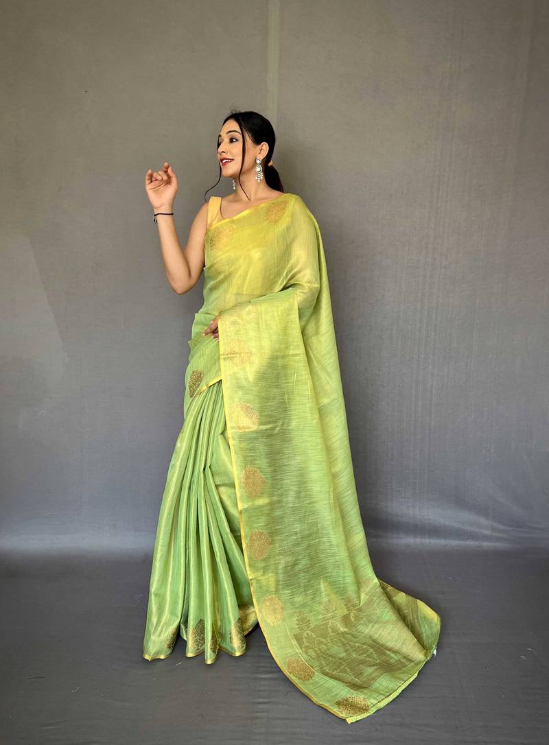 Light green tissue silk saree with unstitched blouse piece