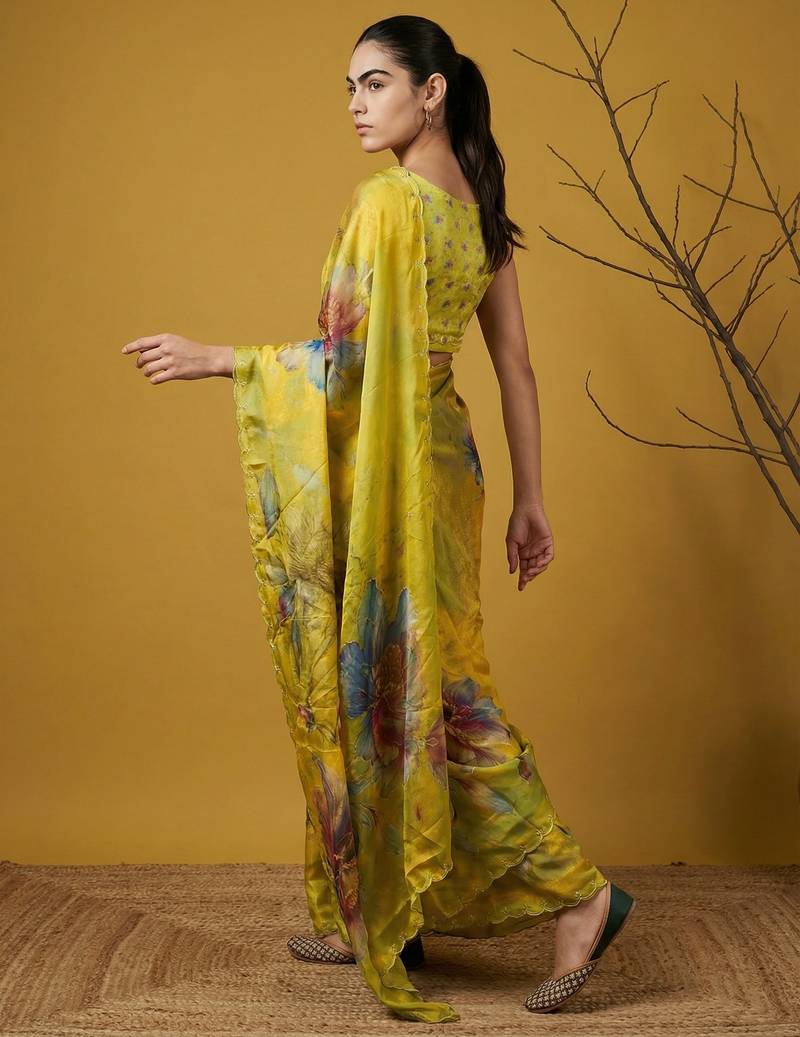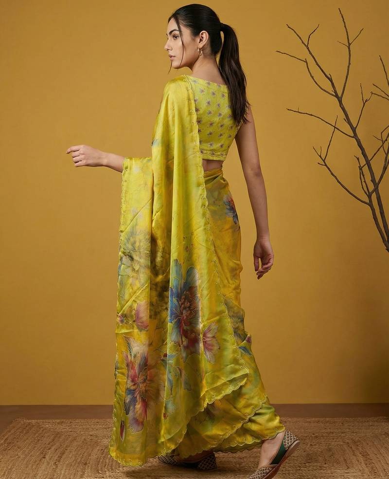 | Product Description | This Elegant Saree Is Crafted From Lightweight Organza Fabric, Offering A Sheer Texture With A Smooth And Graceful Drape. It Features Bold Multicolor Floral Digital Prints Across The Saree, Creating A Striking And Artistic Appeal. The Subtle Embroidered Border Adds A Refined Touch, Enhancing Its Overall Sophistication. Perfect For Evening Parties, Festive Occasions, And Special Events, This Saree Blends Modern Style With Ethnic Charm. Paired With A Matching Blouse Piece, It Creates A Stylish And Eye Catching Traditional Ensemble. |