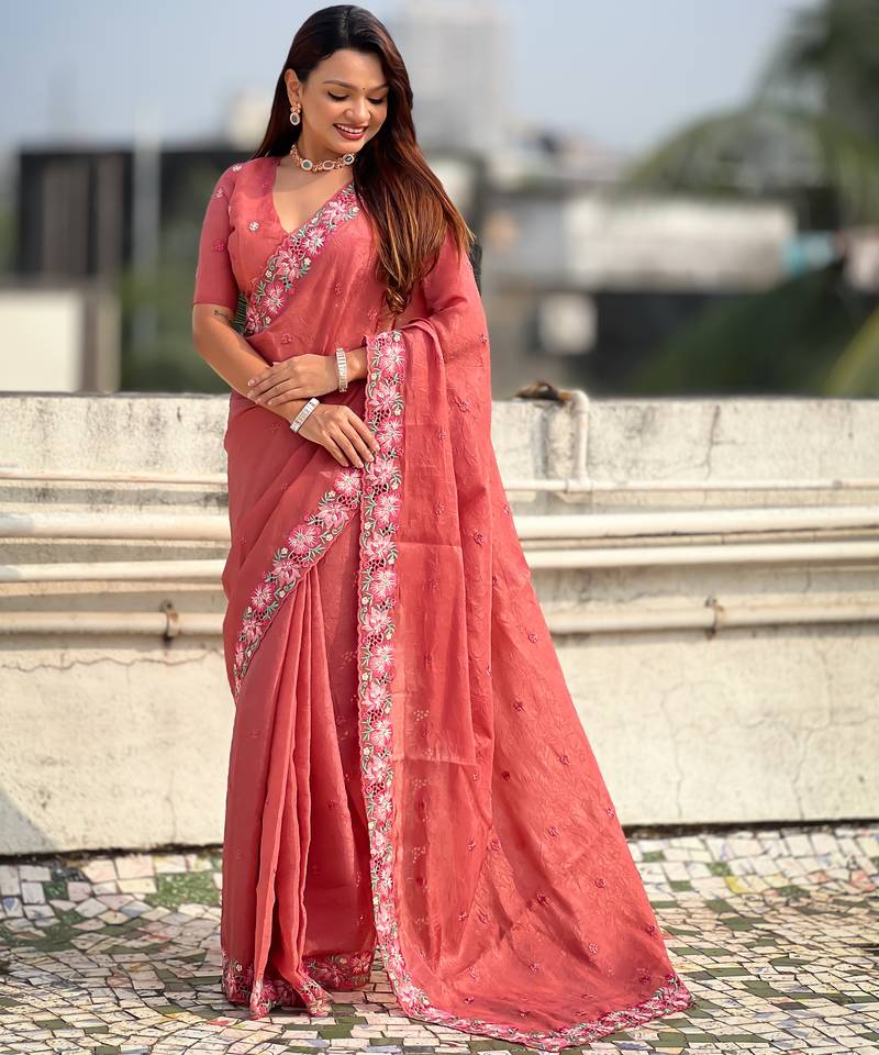 | Product Name | Peach Thread Embroidery Floral Border Work Organza Silk Elegant Festive Style | |