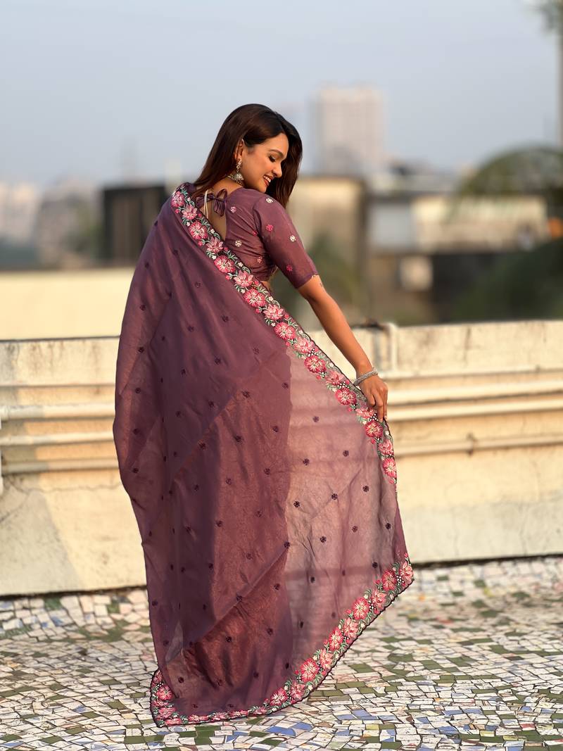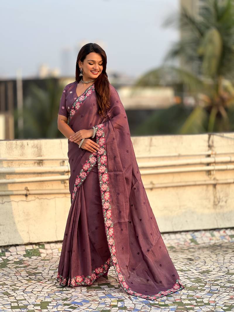 | Product Description | This Elegant Wine Saree Is Crafted From Lightweight Organza Fabric, Offering A Sheer Texture With A Soft And Graceful Drape. It Features Delicate Embroidered Butti Work Across The Body, Complemented By A Beautifully Detailed Floral Embroidered Border That Adds Richness And Charm. The Intricate Thread Work Enhances Its Festive Appeal While Maintaining A Subtle And Classy Look. Perfect For Festive Occasions, Parties, And Special Gatherings, This Saree Exudes Modern Elegance With Traditional Detailing. It Comes With A Matching Blouse Piece To Complete A Stylish And Refined Ethnic Ensemble. |