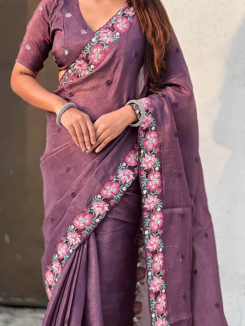 | Product Name | Wine Thread Embroidery Floral Border Work Organza Silk Elegant Festive Style | |