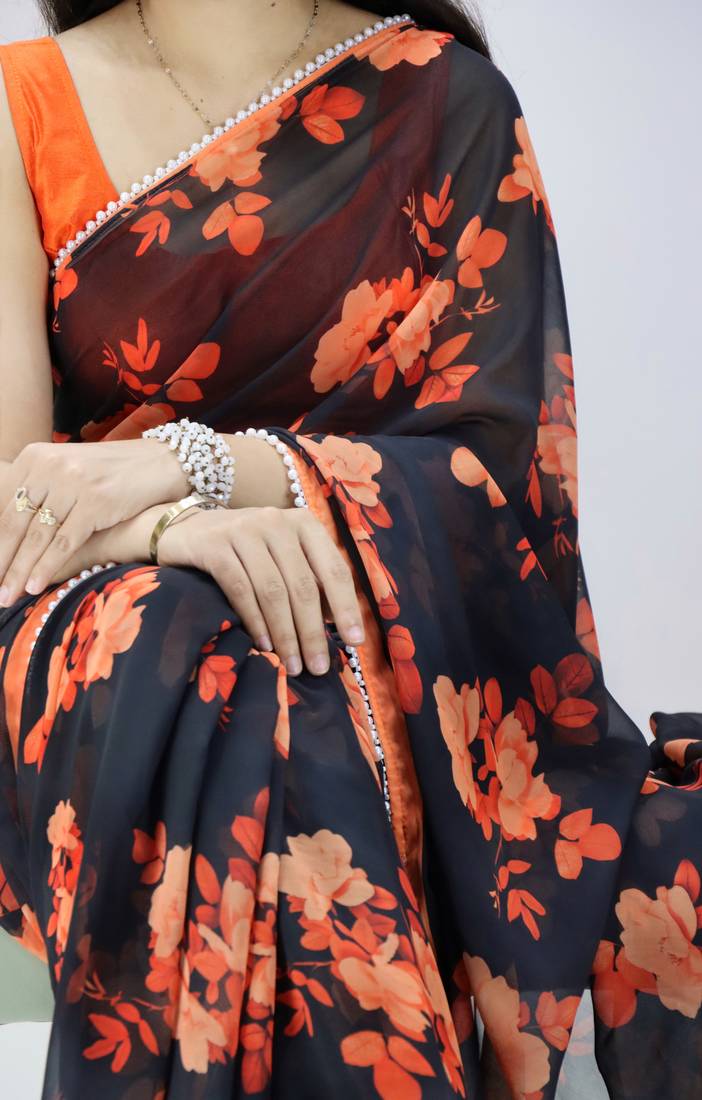 | Product Name | Black Color Floral Printed With Pearl Moti Lace Weightless Saree With Unstitched Blouse | |