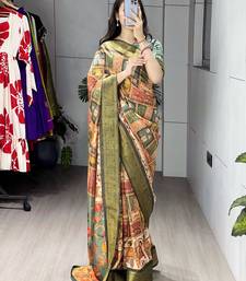 Green color kalamkari printed silk saree with unstitched blouse