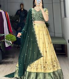 Green color marshmellow rico printed with contrast weaving work lehenga with unstitched blouse