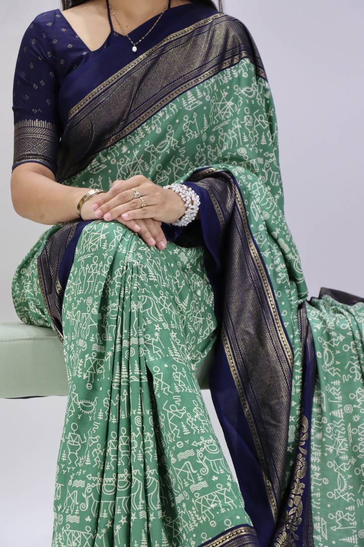 Green color printed with foil work and contrast border soft tussar silk saree with unstitched blouse