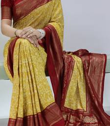 Mustard color printed with foil work and contrast border soft tussar silk saree with unstitched blouse
