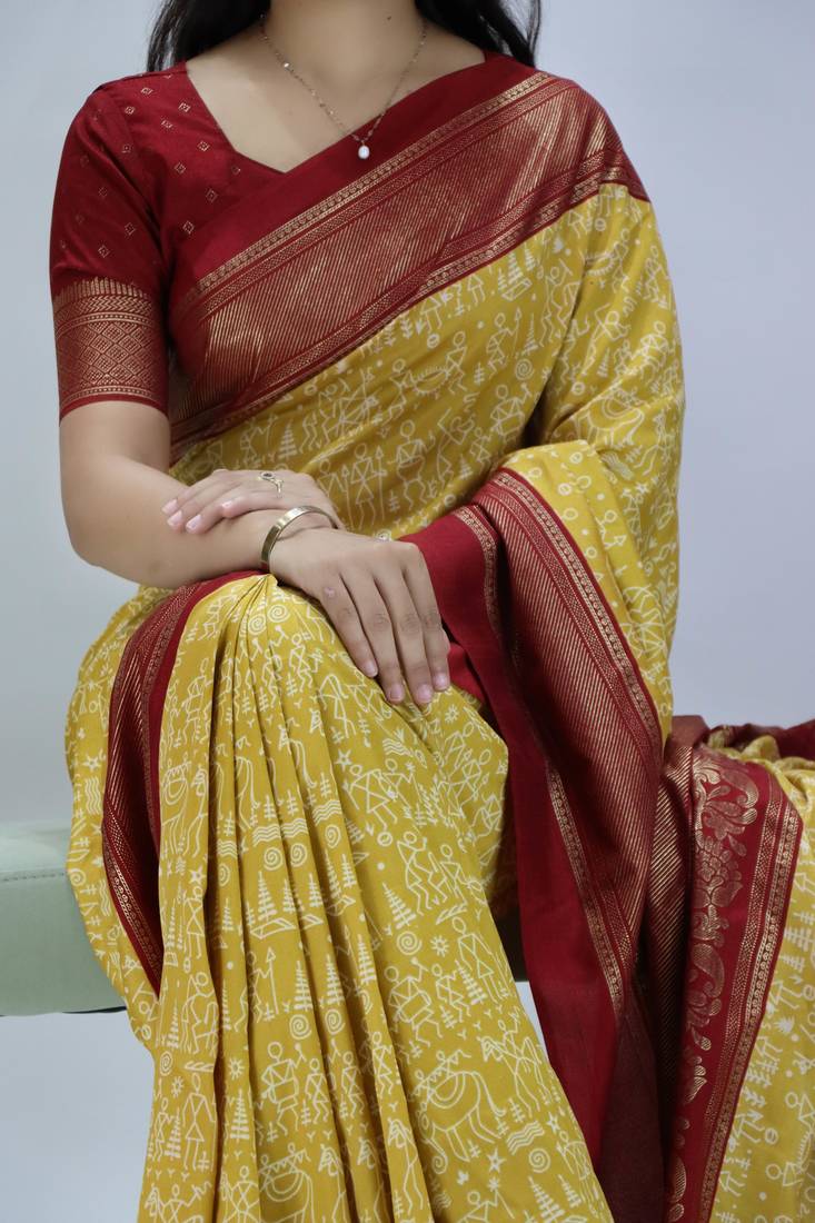 | Product Name | Mustard Color Printed With Foil Work And Contrast Border Soft Tussar Silk Saree With Unstitched Blouse | |