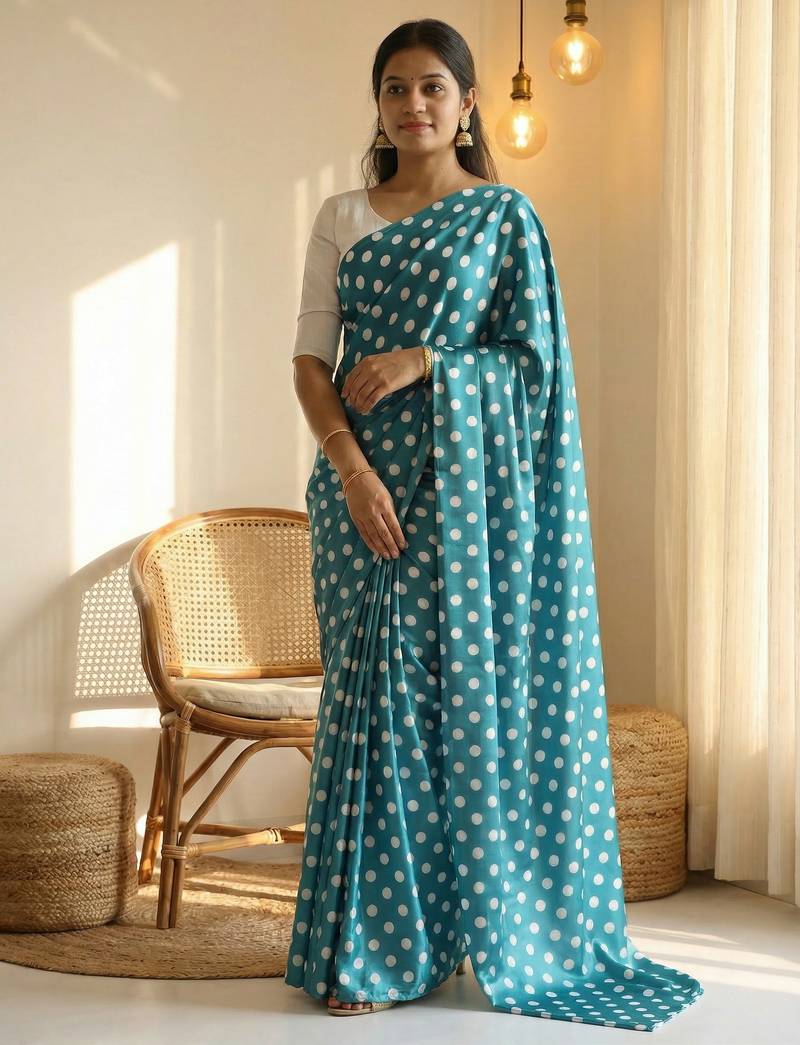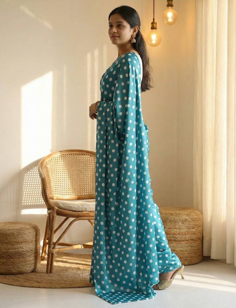 Rama & white color polka dots printed japan satin saree with unstitched blouse