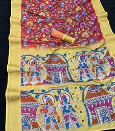 Red color kalamkari printed soft dola art silk saree with unstitched blouse