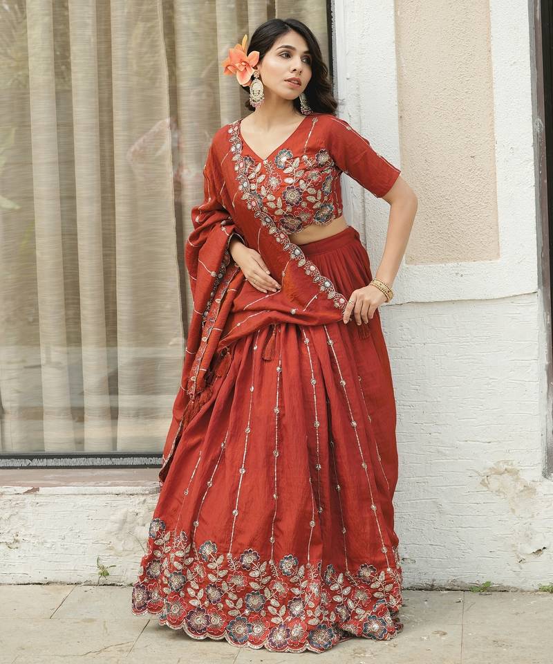 | Product Description | Drape In Our Radiate Elegance In This Rust Fenta Textured Silk Lehenga Featuring Vertical Sequin Accents And A Heavy, Multi Colored Floral Pipe Bead Style Embroidered. Perfect For Weddings And Special Occasions, This Designer Lehenga Blends Luxury, Tradition, And Timeless Elegance. |