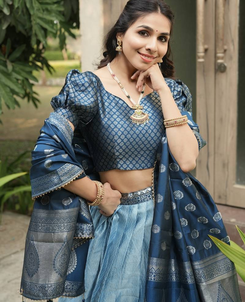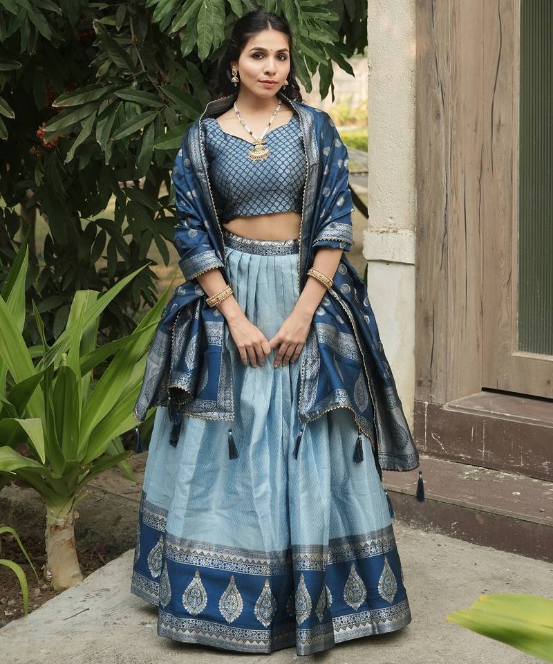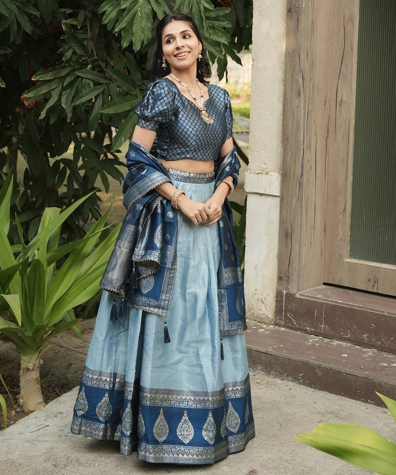 Sky color zari weaving work kanchipuram silk pattu lehenga choli with unstitched blouse