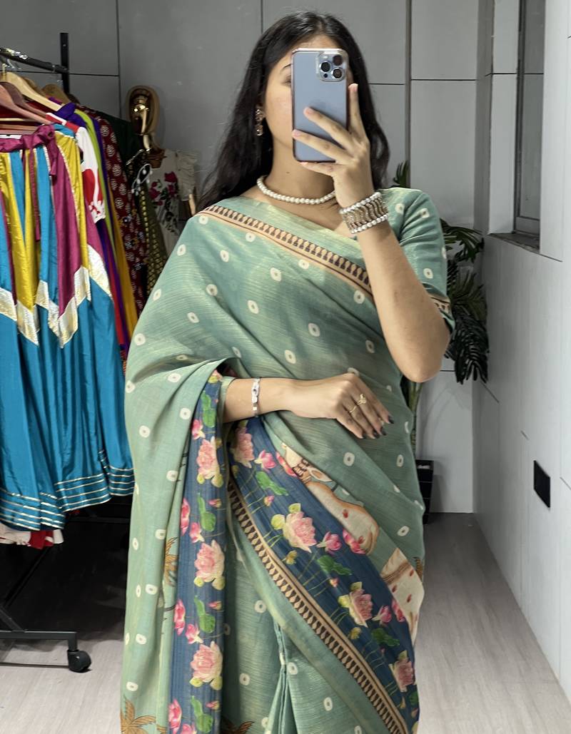 | Product Name | Teal Color All Over Printed Shimmer Saree With Unstitched Blouse | |