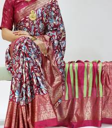 Wine color kalamkari printed with foil work soft dola art silk saree with unstitched blouse