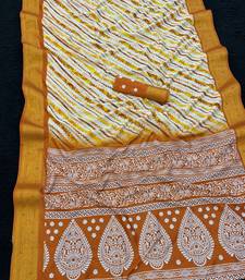Yellow color printed with weaving border soft dola silk saree with unstitched blouse