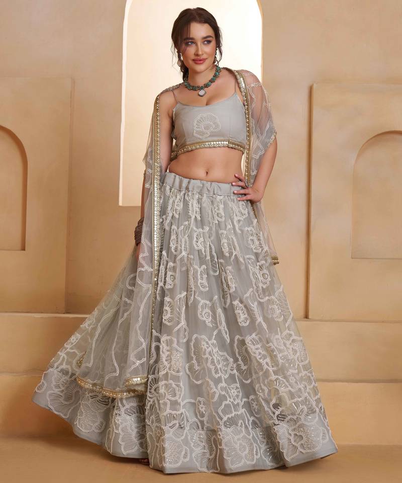| Product Description | "Light Gray Embroidered Net Semi Stitched Lehenga Choli Wedding & Party Wear Chaniya Choli For Women