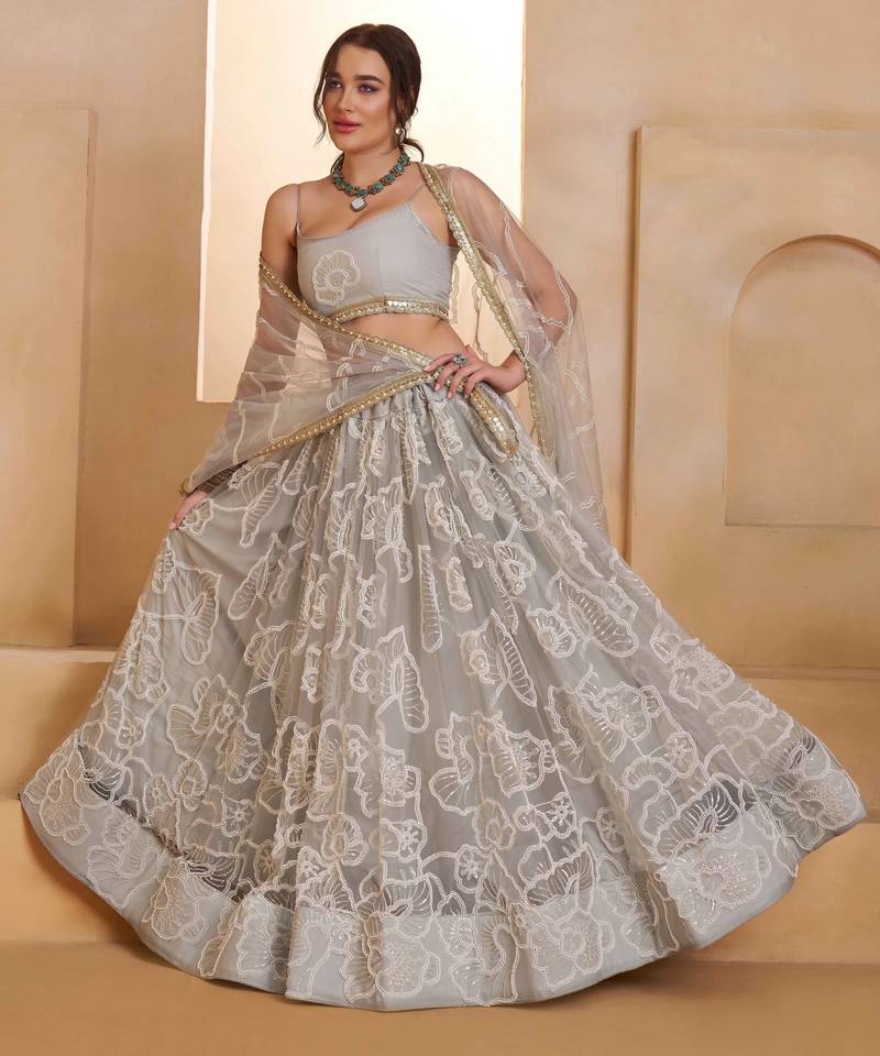 Light gray net sequin embroidered lehenga set with choli and dupatta