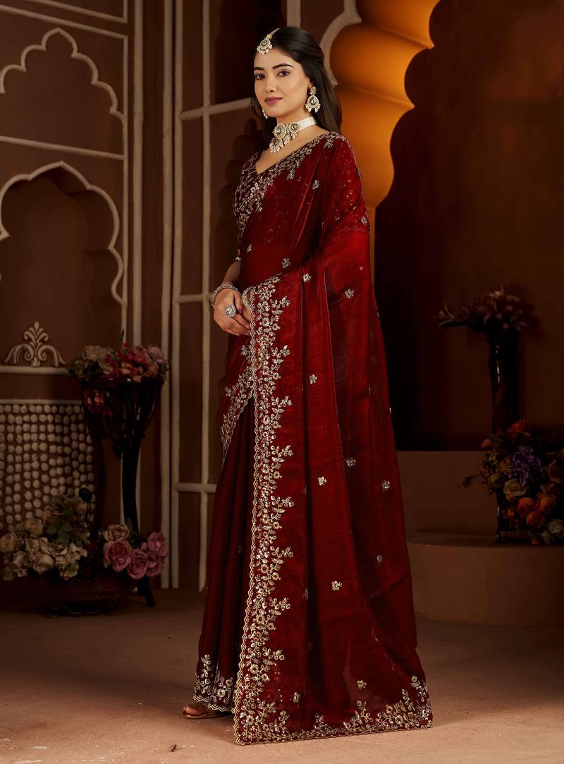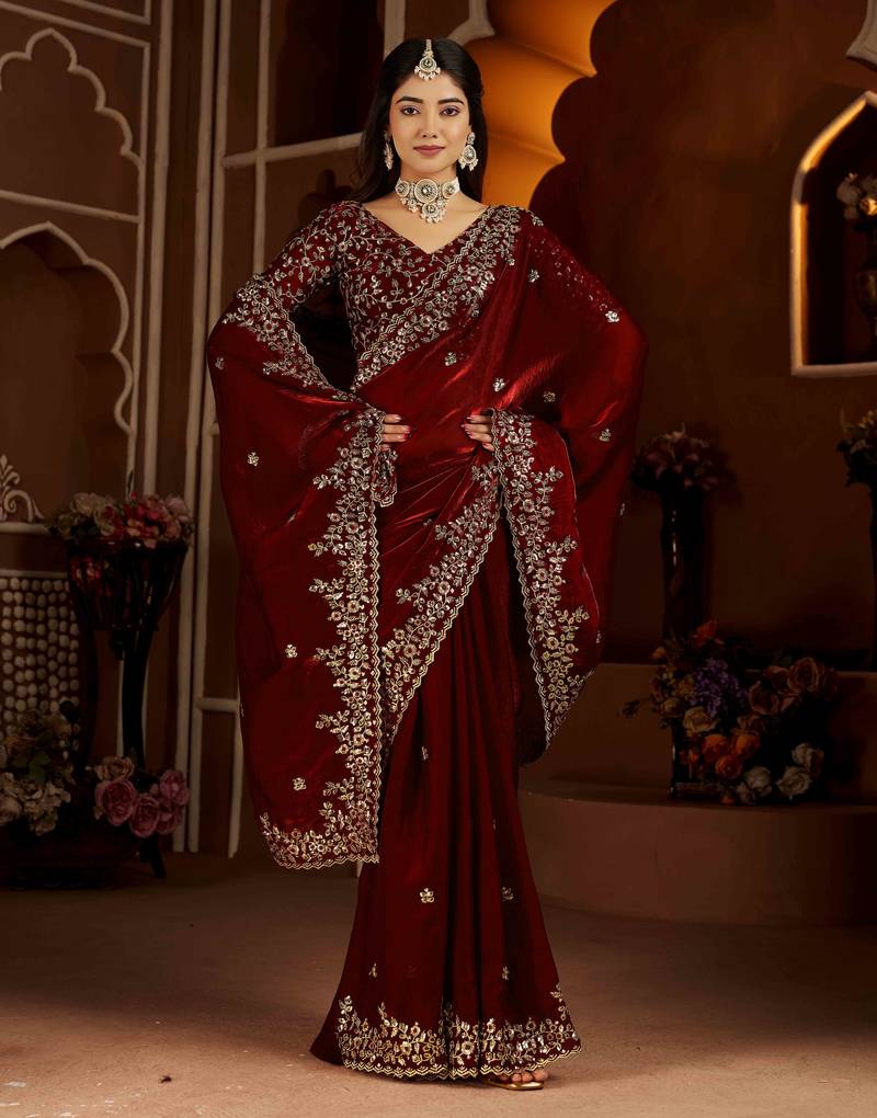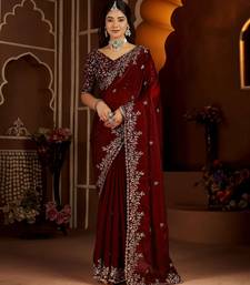 Maroon color satin silk saree with heavy jari embroidery work & designer blouse