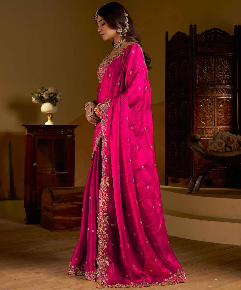 | • | Saree | : | Color- Pink / Fabric- Satin |