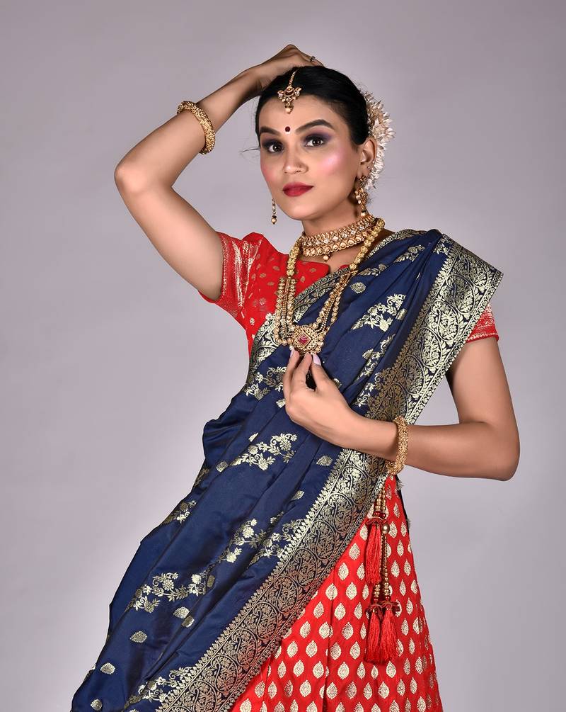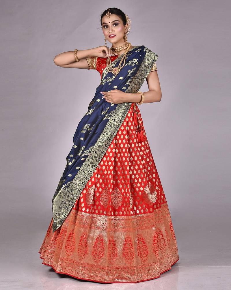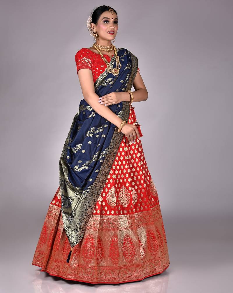 Red & blue latest kanjivaram silk lehenga with zari woven