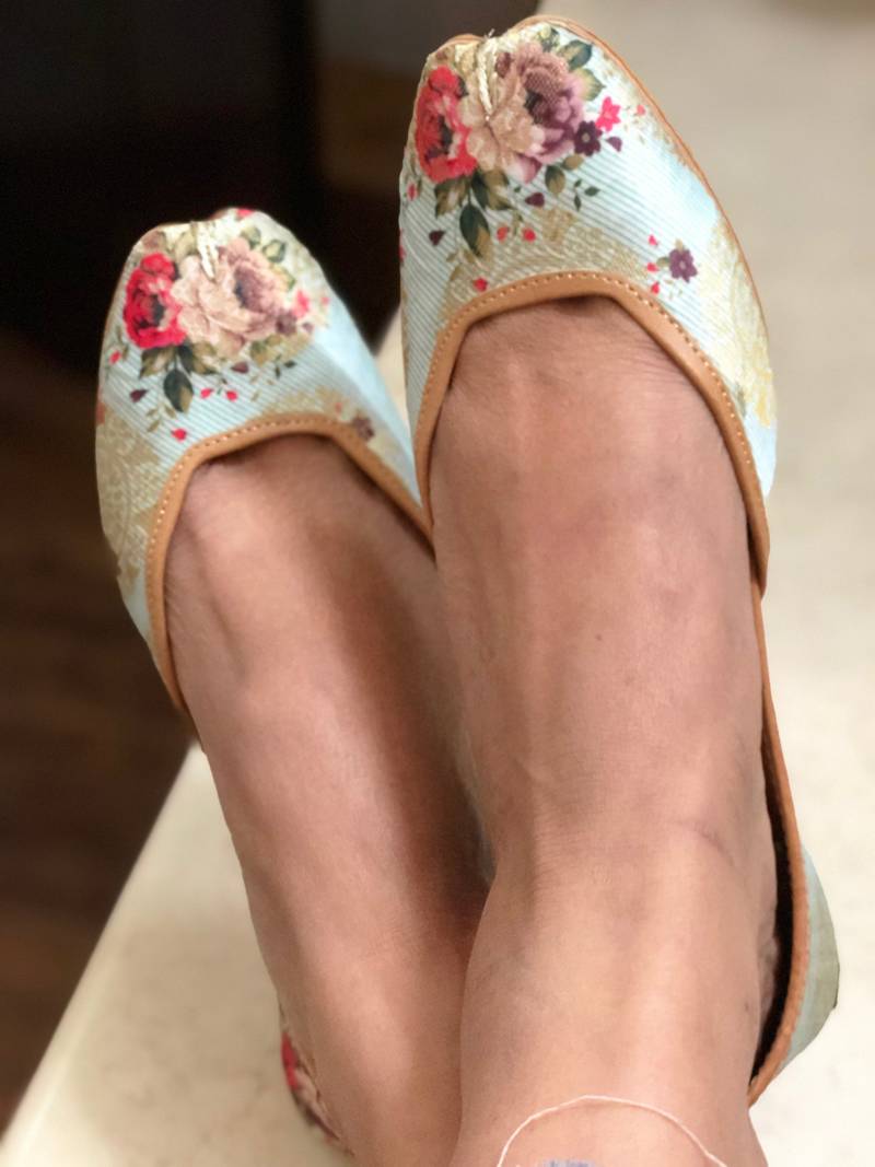 | Product Name | Blue And Gold Floral Print Shoes, Printed Women Jutti, Indian Ethnic Shoes | |