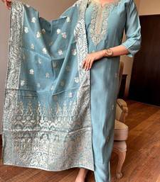 Aqua blue color chanderi viscose straight suit stitched