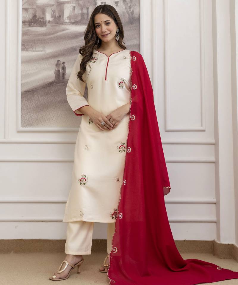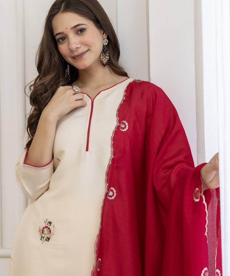 | Product Description | Be The Dazzling Diva Clad In This Off White Chanderi Salwar Kameez With Exquisite Designs And Patterns. The Embroidered Work On The Attire Adds A Sign Of Beauty Statement To Your Look. Comes With Matching Bottom And Red Dupatta. (Slight Variation In Color, Fabric & Work Is Possible. Model Images Are Only Representative.) |