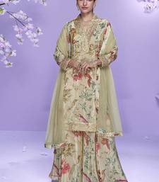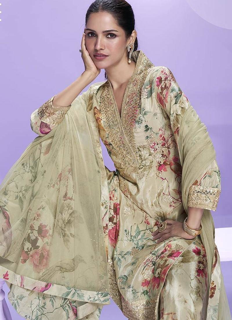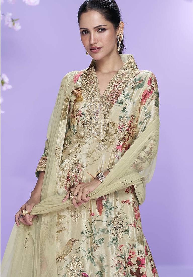 | Product Name | Cream Printed Chinon Silk Suit Semi Stitched Up To 42" Size | |
