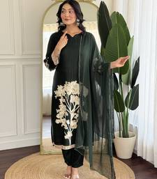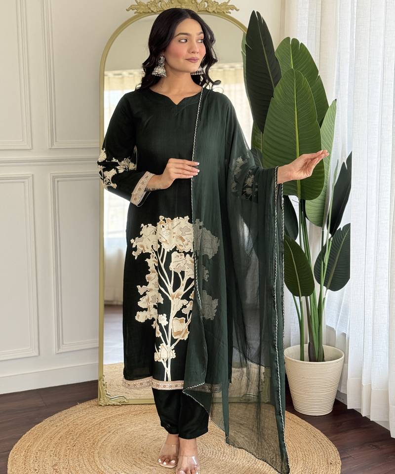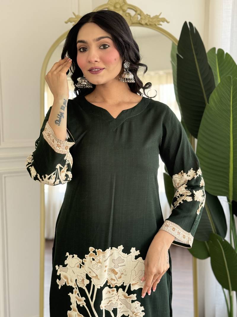 Dark green floral printed viscose rayon kurta with trousers & dupatta stitched