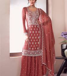 | Product Description | A Festive Dark Peach Color Chinon Silk Sharara Suit Featuring Swaroski Work And Embroidery. Styled Withf Ull Sleeves, Keyhole Neckline And A Drawstring Closure, Dupatta ”Ideal For Pooja And Festive Occasions |