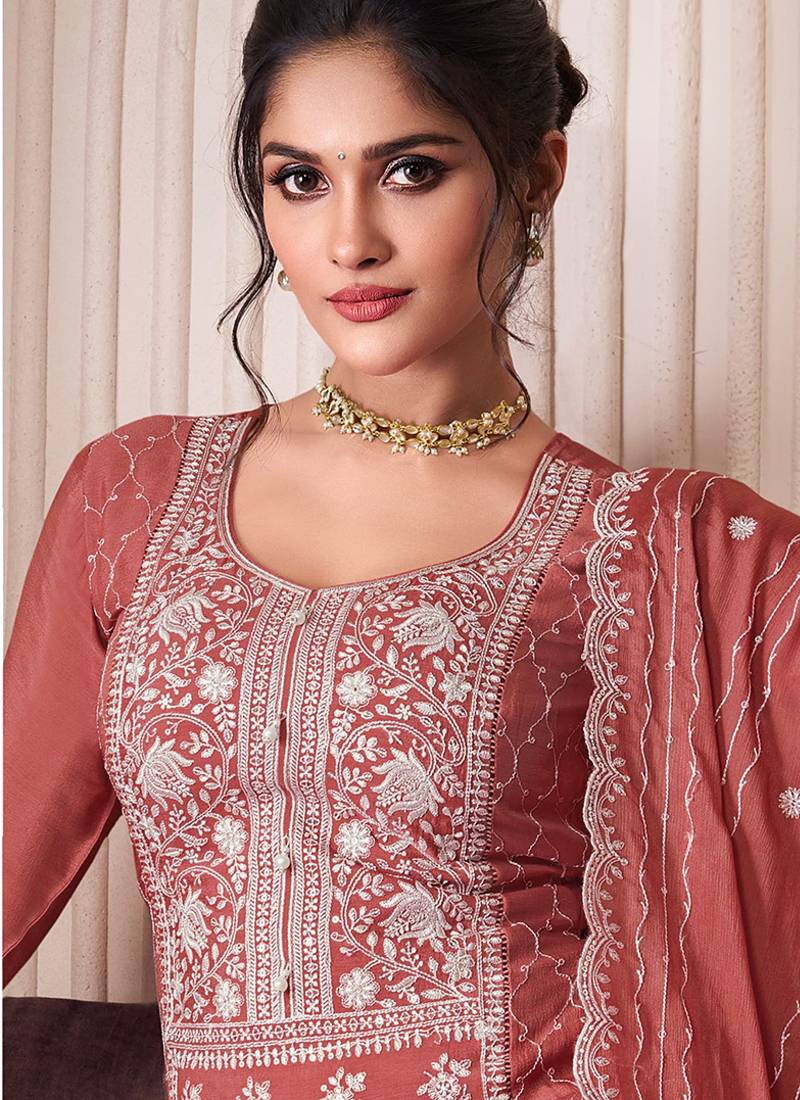 Dark peach sequin and thread embroidery palazzo suit semi stitched
