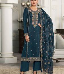 Dark teal moonga silk embroidered pant style suit semi stitched