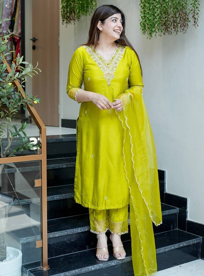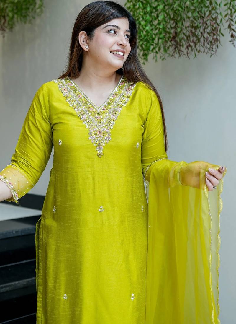 Embroidered lime viscose chanderi festival trendy salwar kameez stitched