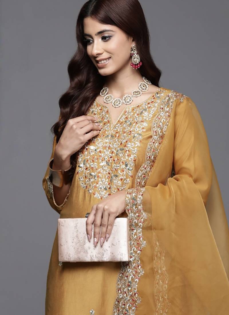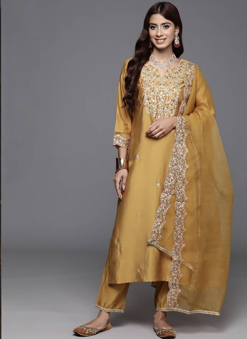 | Product Name | Embroidered Mustard Chanderi Engagement Salwar Suit | |