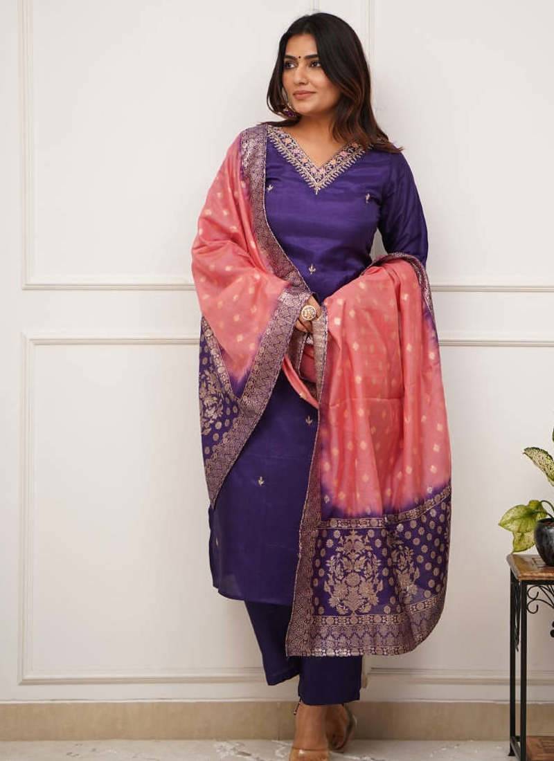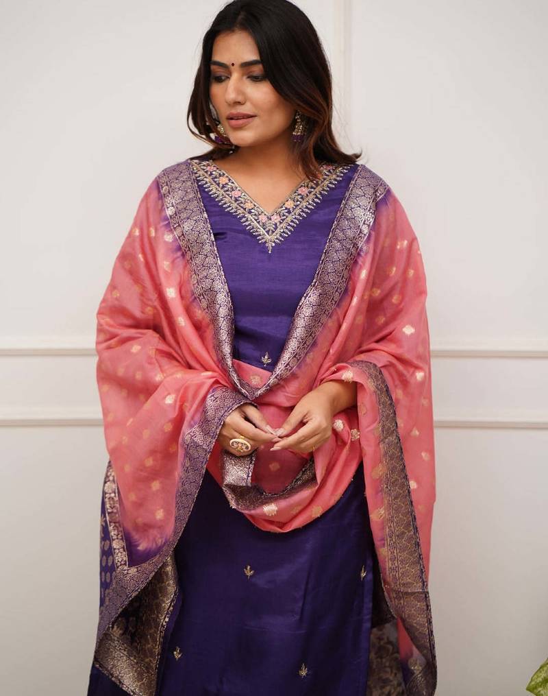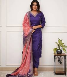 Embroidered sequins vichitra salwar suit in purple stitched