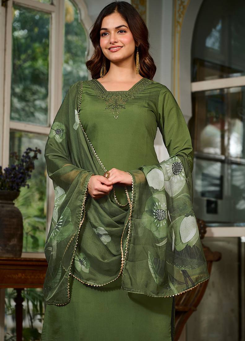 | Product Description | Add Grace And Charm For Your Look In This Dark Green Chanderi And Viscose Salwar Kameez. The Lovely Embroidered Work Through The Dress Is Awe Inspiring. Comes With Matching Bottom And Dupatta. (Slight Variation In Color, Fabric & Work Is Possible. Model Images Are Only Representative.) |