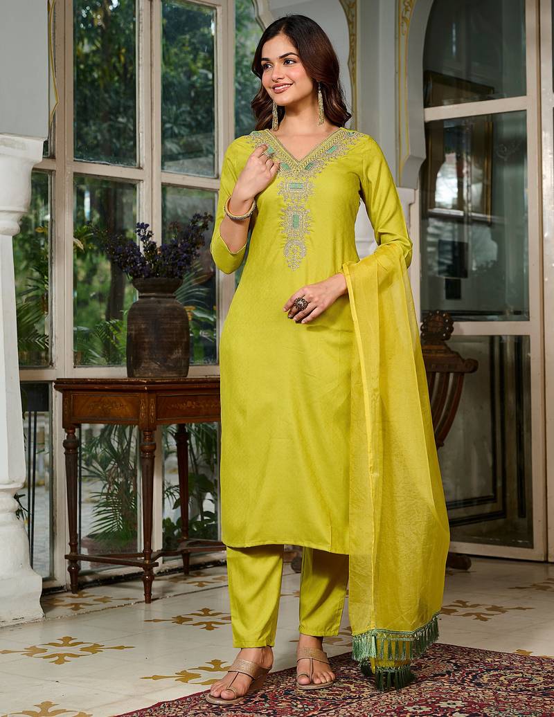 Fancy viscose rayon embroidery work salwar kameez in lemon stitched