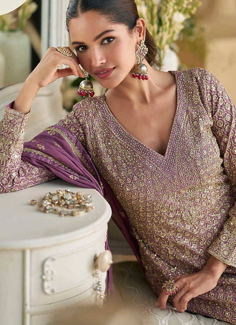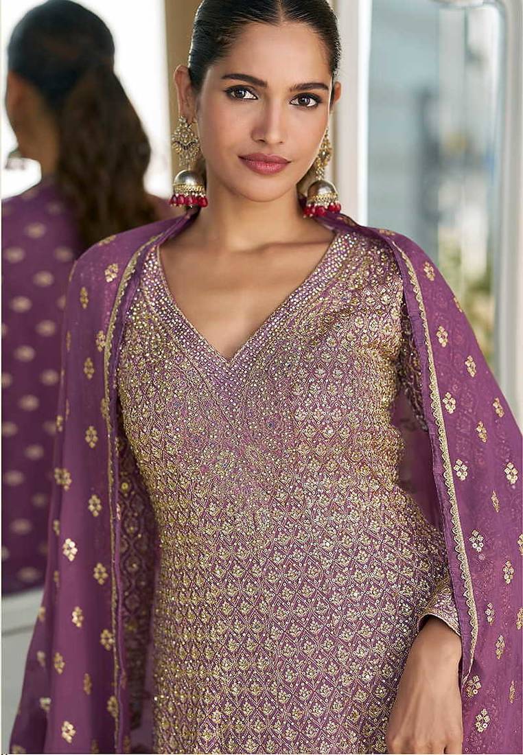 | Product Description | Crafted In Georgette This Lavender Color Features Minimal Embroidered Lace Detailing. Designed With A V Neckline, 3/4th Sleeves And Front Hook Eye Closure, It Is Paired With Straight Fit Mid Waist Palazzo And A Matching Dupatta—Ideal For Festive And Pooja Occasions. Note : This Suit Will Be Sttiched Free Size 42". |