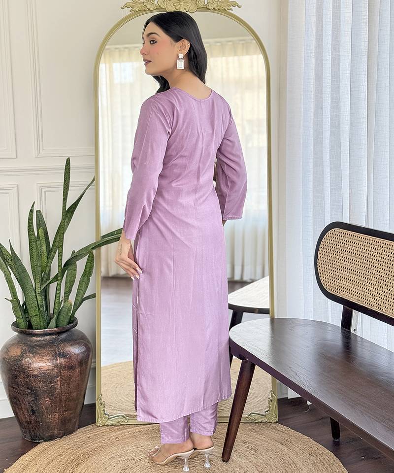 | Product Name | Lavender Rayon Readymade Salwar Suit With Embroidered Work For Festival | |