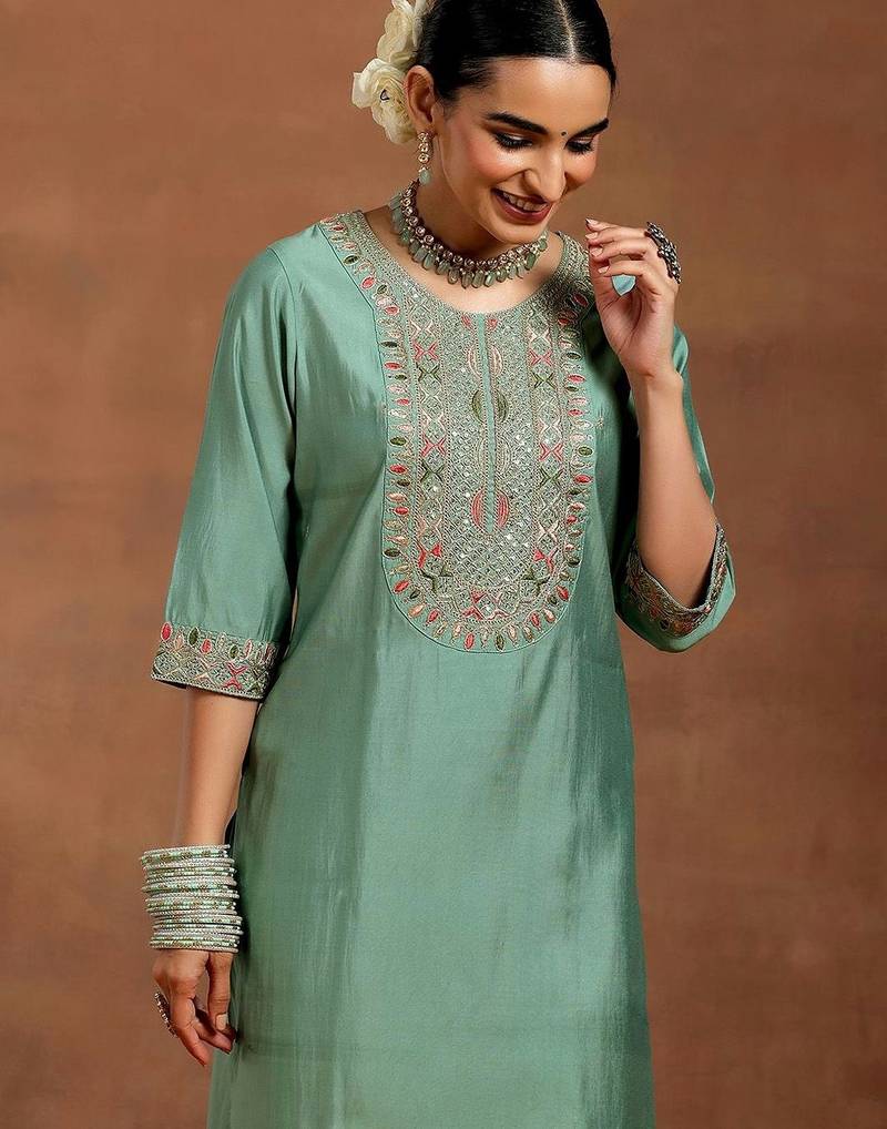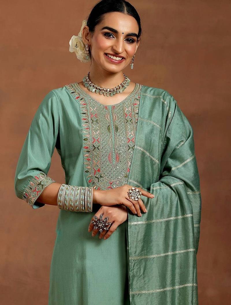 | Product Description | Our 3 Piece Light Pista Embroidered Chanderi Straight Suit Set Features A Short Kurta With A Round Neckline, Three Quarter Sleeves, And A Statement Yoke. Complemented With Pleated Trousers With A Partially Elasticated Waistband And Roomy Pockets, And A Dupatta. Highlighted With Sequins And Thread Work, This Style Is Perfect For Festive Celebrations. |