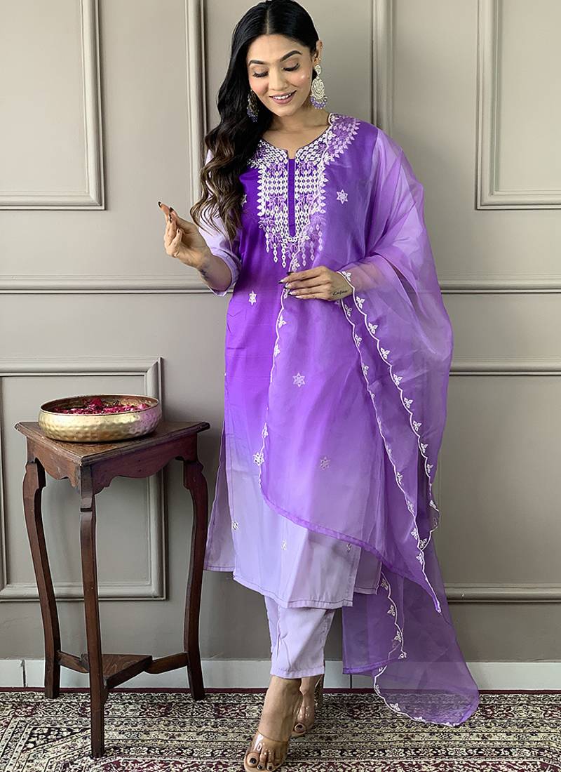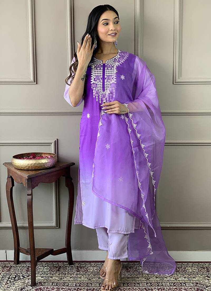 Light purple color muslin embroidered kurta set stitched