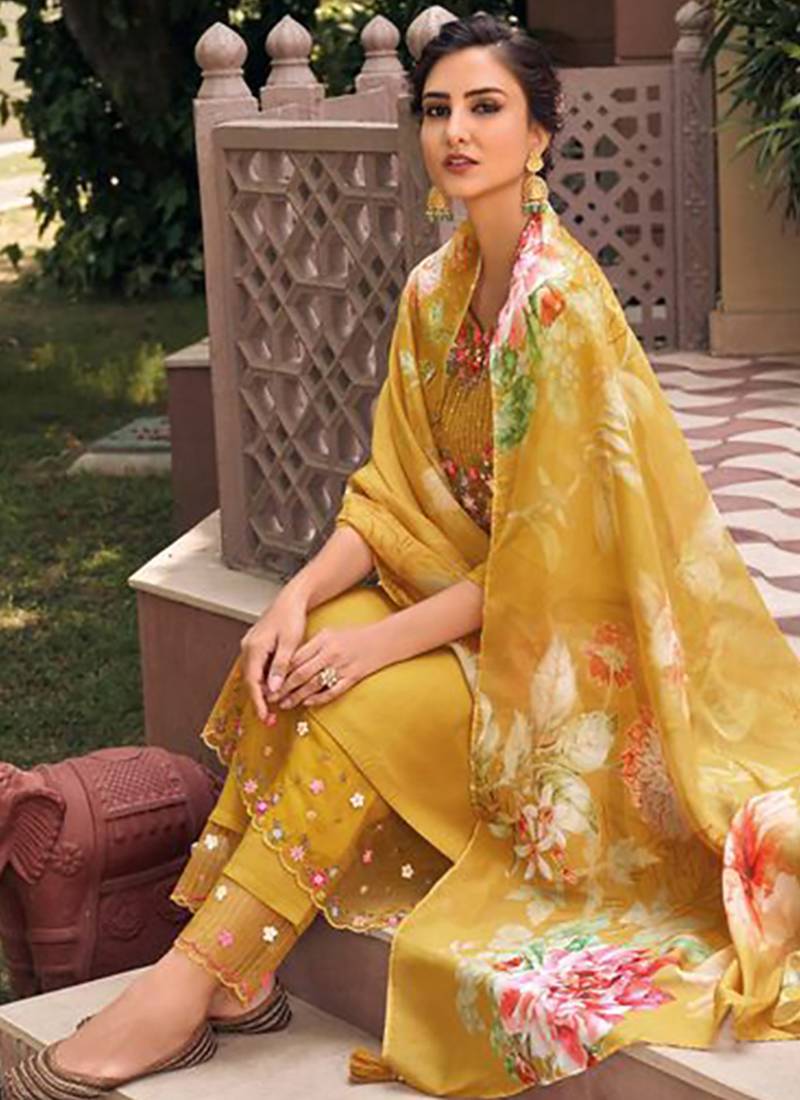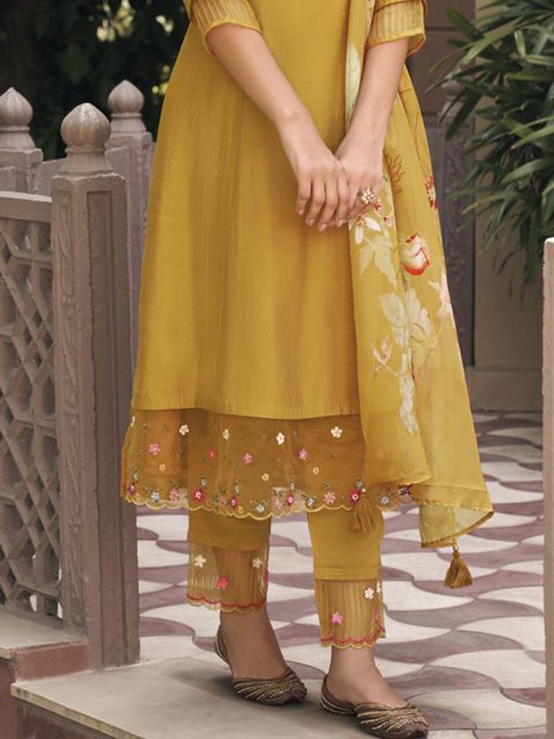 | Product Description | Delicate And Festive, This Mustard Anarkali Suit Is Crafted In Lightweight Viscose Chanderi Fabric Ideal For Pooja And Other Celebratory Occasions. The Kurta Features Intricate Zardosi Embroidery That Adds Subtle Shimmer And Refined Texture. Designed In A Straight Silhouette With Three Fourth Sleeves And A Notched Neckline, It Comes Paired With A Coordinated Dupatta. |