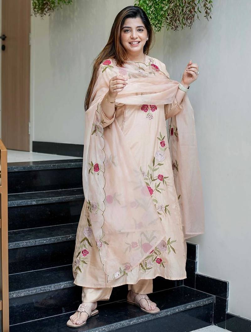 Peach embroidered chanderi silk kurta set with palazzo and dupatta ready to wear stitched