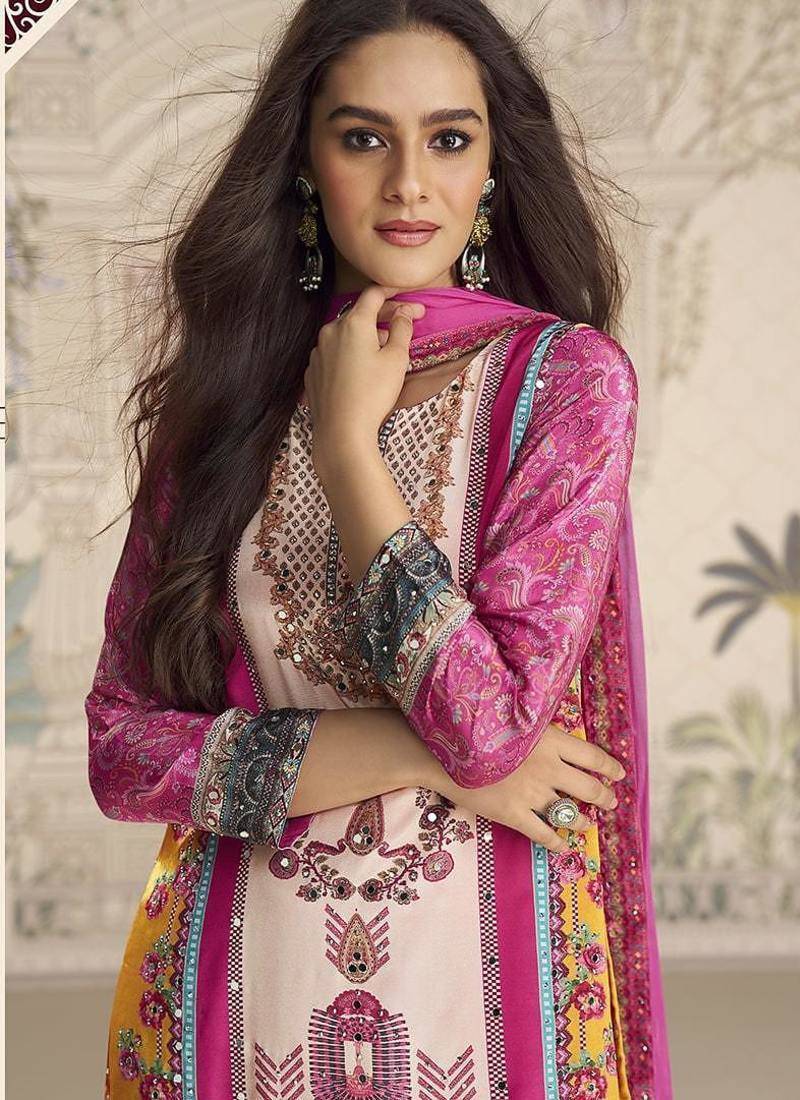 | Product Description | A Pink Embrodiered Delight, This Crepe Silk Kurta Dazzles With Mirror And Print Detailing And Comes With A Matching Palazzo And Dupatta—Blending Comfort And Charm.Note : This Suit Will Be Sttiched Free Size 42" |