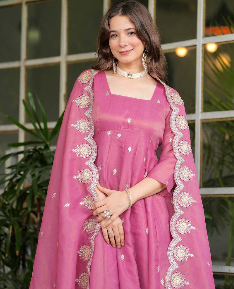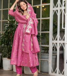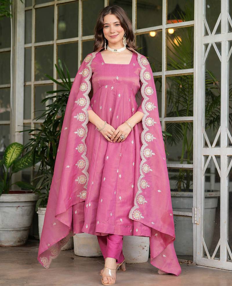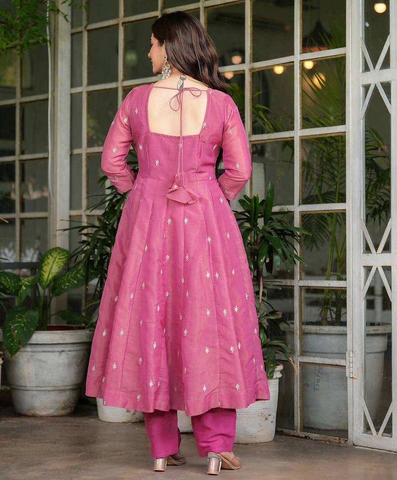 Pink embroidered chanderi silk anarkali salwar kameez stitched