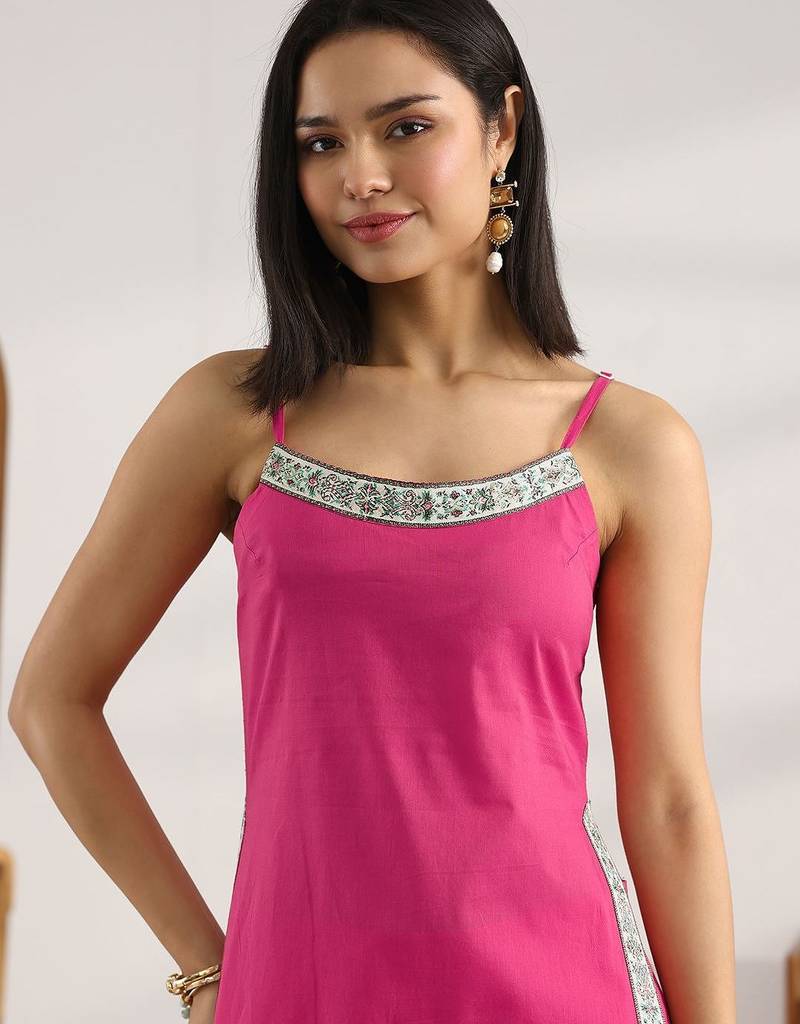 | Product Description | Our 3 Piece Pink Cotton Straight Fit Kurta Set Features A Strappy Neckline, No Sleeves Shoulder, And Statement Yoke. Complemented With Straight Pants With A Partially Elasticated Waistband And 2 Pockets, And A Printed Dupatta. Adorned With Ethnic Motif Printed, This Style Is Perfect For Casual Wear. |